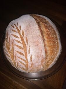 - Turn your dough out of your banneton onto parchment paper. Score the top and place in your hot Dutch oven.