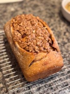 - Prepare the crumble (optional): While the loaf is baking, in a small bowl, combine 23 g bread flour, 23 g brown sugar, 12 g old-fashioned rolled oats, 1/4 tsp cinnamon, Pinch of nutmeg, and a Pinch of salt. With a fork (or your fingers), mash in the 17 g cold butter, cubed. Add 2 tsp apple cider and mix together.Note: The crumble will fall off when you slice the loaf – we like to butter our slice and sprinkle the fallen pieces on top! Skip the crumble if you prefer mess-free slicing.
