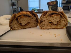 My loaf is cold fermenting, but I’m sure it will be good! I’ve made cinnamon raisin swirl sourdough before. I bake almost exclusively in loaf pans now with two identical pans.. I use a baking steel on the rack below my sourdough loaves and I’ve never had a problem with anything being close to being burned. I will post a picture of my loaf next when it’s finished. I have a photo of my cinnamon swirl loaf.