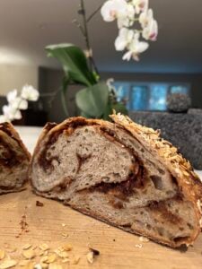 I just cut into this and I can tell you it’s amazing. It is dessert bread that’s super apple-y. My parents were blown away. It is gorgeous and delicious. I made it as a boule so the shading instructions were a bit off but it swirled nonetheless. I did not make the topping. Instead I sprayed the dough with water and rolled it in oats instead of using rice flour in my baneton.