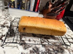 Made it using AP flour because I couldn’t wait to get more bread flour! Thought I’d share the result…still turned out good but I did have to add a bit more flour to get the dough to come together during the mixing stage which probably contributed to it being a bit more dense than it would be with the bread flour. And, it did take about 20-25 min in my KitchenAid. I’m getting mixer jealous reading what you all are using! I made the tangzhong and soaked the raisins the night before and did the proofing in my oven with the light on as I also don’t have the fancy proofing box;) I made it in a slightly more narrow loaf pan but it still came out delicious. I always put a loaf pan on top of my loaf pan for the first 20 or so in the oven to help with spring and then remove it to finish off for 20-25min and did that here too. Can’t wait to try it again with bread flour:)
