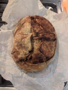 - Flip the dough onto parchment paper, score the top, and bake for 30 minutes covered and 10–15 minutes uncovered (watch closely to prevent burning).