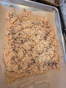 • Bake and Score: Bake at 325°F/160°C for 10 minutes. Remove from the oven and use a pizza cutter or sharp knife to score the dough into your desired cracker shapes.