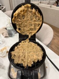 Only problem is, we weren’t able to get a waffle actually made. Every time I put the batter in, it would cook and upon opening after it was done, it would not stay together. As you can see from photos, it just ripped apart. It was not stuck to the waffle maker. As you see in next photo, I could easily get it off but not all as one big waffle. We used spray and I tried 3 more times with more spray, less batter, different heat settings. All turned out the same and ripping a part. It tastes fantastic but we couldn’t get an actual waffle made.