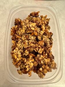 Traditional granola recipes don’t include sourdough discard – they rely on liquid oil (like olive oil) and sweetener (like honey) to bind everything. Some recipes also add nut butter for extra stickiness.