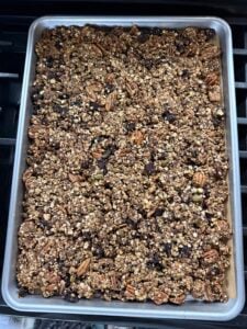 - Bake for 30 minutes, rotating sheet pan halfway through. If you prefer clusters, do not break apart the mixture during baking. If you prefer a loose granola mixture, toss the mixture halfway through baking.