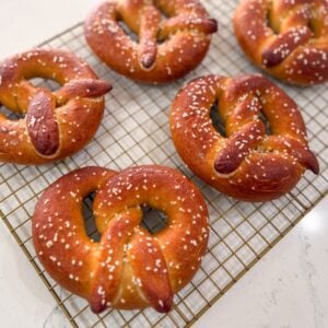 If you've never made homemade pretzels before, this is the recipe to start with. These sourdough pretzels come out soft and chewy inside with a beautifully crisp, dark exterior and that classic pretzel flavor you know and love — and we achieve it all with just baking soda, no lye required. These are addicting!!