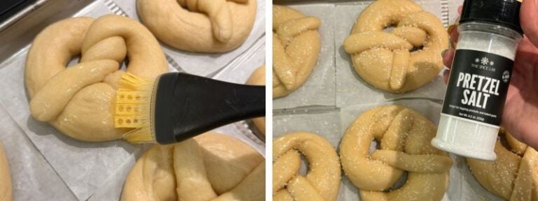- Top the pretzels: Brush all of the boiled pretzels with 1 tbsp unsalted butter (melted). Sprinkle with Pretzel salt to taste.