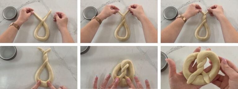 - Shape into a pretzel: form a U shape, cross the two ends over each other twice to create a twist, then fold the twisted ends down onto the bottom curve. Place a small drop of water where the dough meets itself, then press firmly to seal.