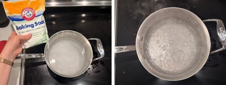 - Preheat and prep the boiling water: When ready to bake, position one oven rack in the center and one at the very top. Preheat oven to 450°F (230°C) convection or 475°F (250°C) conventional. In a 4-quart saucepan, combine 6 cups water and 1/2 cup baking soda before turning on the heat (adding baking soda to already-boiling water will cause it to foam up and overflow). Bring to a boil over medium-high heat.