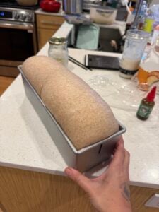 - Cover with plastic wrap and let rise in a warm spot (78-85°F/25-29°C) until the dough rises to be even with (or even slightly above) the rim of the loaf pan (about 6-9 hours). It should feel aerated and bouncy when you tap the surface.