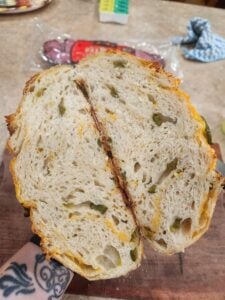 For those preferring sandwich loaves, the recipe works well (see pics), but your normal processes and timing MUST adapt to the dough. These things may impact your loaf if you are accustomed to baking the 500 g loaf: 1) the pickled jalapenos, 2) the inclusions, and 3) the smaller loaf size.