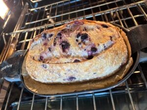 Quick tip: When you’re using blueberries or other inclusions that might leak, I suggest skipping the wood pulp banneton. If the blueberries leak during the cold retard, it may stain your banneton. I finally found a good use for those silicone bannetons!