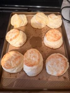 - Pull them early – lightly golden, not deep brown. Multiple testers (and I!) found that baking until deep golden brown led to a dry interior. For the most tender, moist biscuit, pull them when the tops are lightly golden, and the internal temp hits 200–205°F (93–96°C).