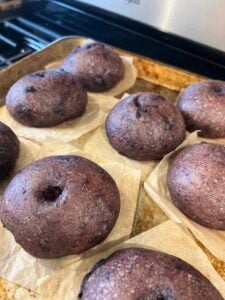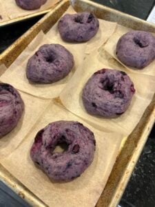 Interesting note: Anthocyanins are pH-sensitive, meaning they can change color depending on how acidic or alkaline the environment is. Adding baking soda to the boiling water makes it alkaline – and these lovely deep-purple bagels turn a surprising blue-green or grayish-green color!