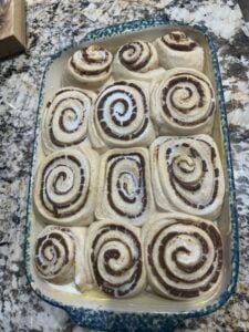 - When the cinnamon rolls are finished, let cool for about 10 minutes before adding your icing or glaze. Enjoy!