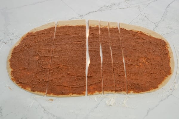 This will make a total of 12 cinnamon rolls that are ideally 1.5-2″ wide. Cut a little off each side to keep the strips tidy.