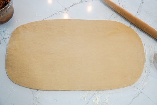 Roll into a rectangle that’s about ¼” thick. Aim for the width of the rectangle to be between 18-24″. While you roll, lift the sheet of dough regularly to prevent sticking; push additional flour underneath with a bench scraper as needed.